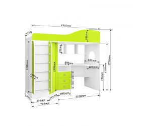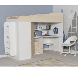 Второй вид кроватей-чердаков рассчитан на возраст детей от пяти лет. Спальное место в таком случае располагается на высоте 1,3-1,6 метра. На первом ярусе чаще всего есть шкаф и рабочая зона в формате письменного стола и книжных полок.