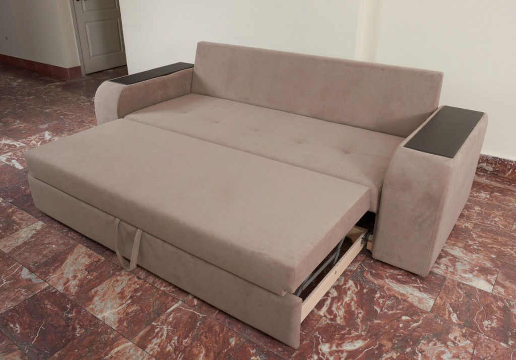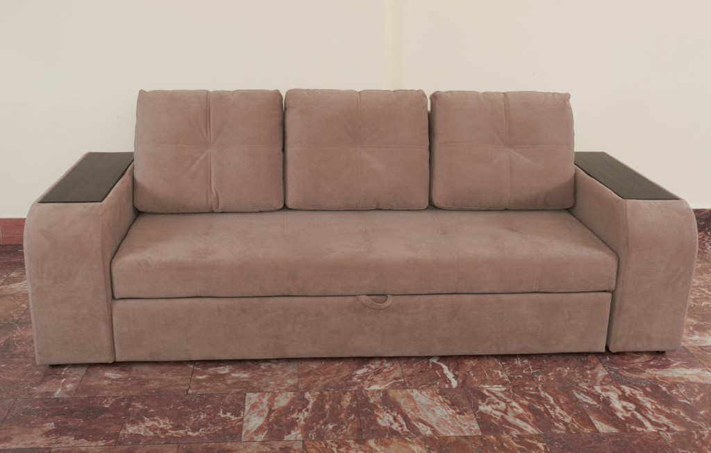 Диван-кровать универсального стиля. В верхней части подлокотников, выполненных из материала МДФ, расположены встроенные ящики для постельных принадлежностей или хранения мелочей, дополнительно имеется бельевой ящик в оттоманке. Предназначен для ежедневного сна.